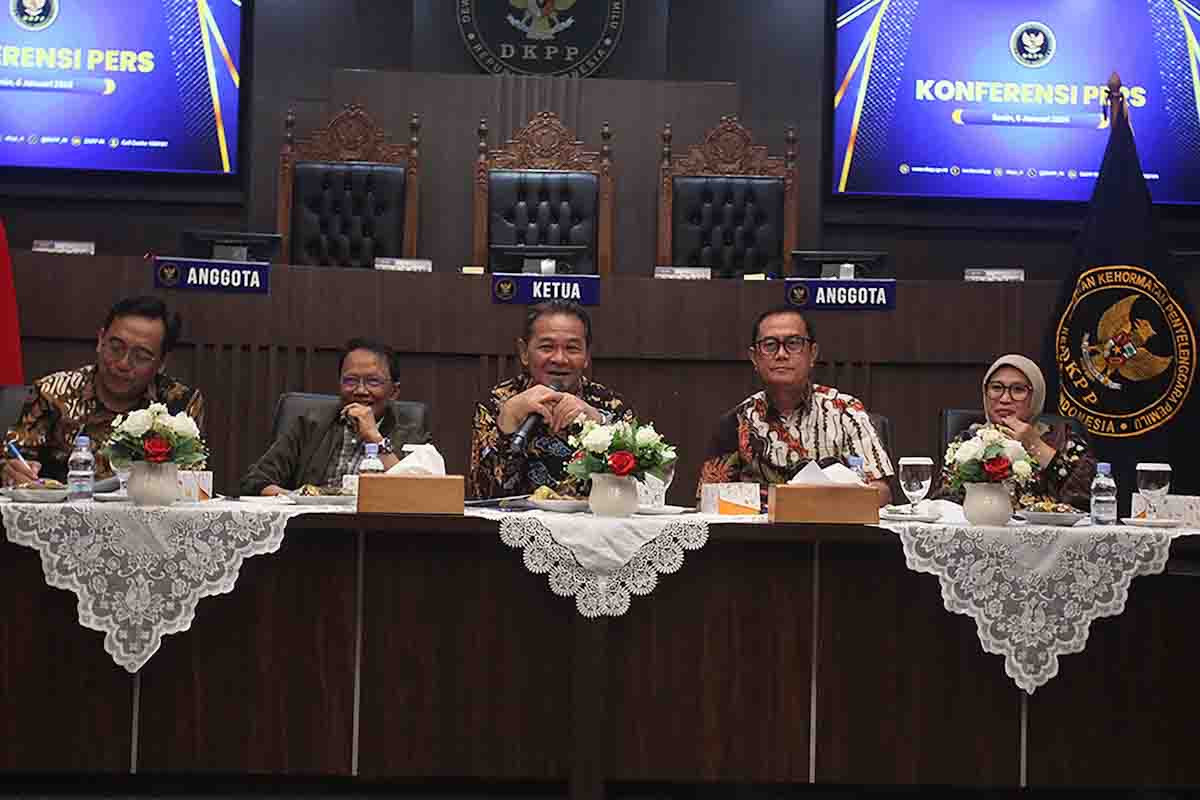 AKTUALITAS.ID – Ketua Dewan Kehormatan Penyelenggara Pemilu Heddy Lugito, bersama sejumlah Anggota DKPP I Dewa Kade Wiarsa Raka Sandi, J. Kristiadi, Muhammad Tio Aliansyah dan Ratna Dewi Pettalolo, usai memberikan pernyataan saat DKPP menggelar konferensi pers akhir tahun di Gedung DKPP, Jakarta, Senin (6/1/2025).