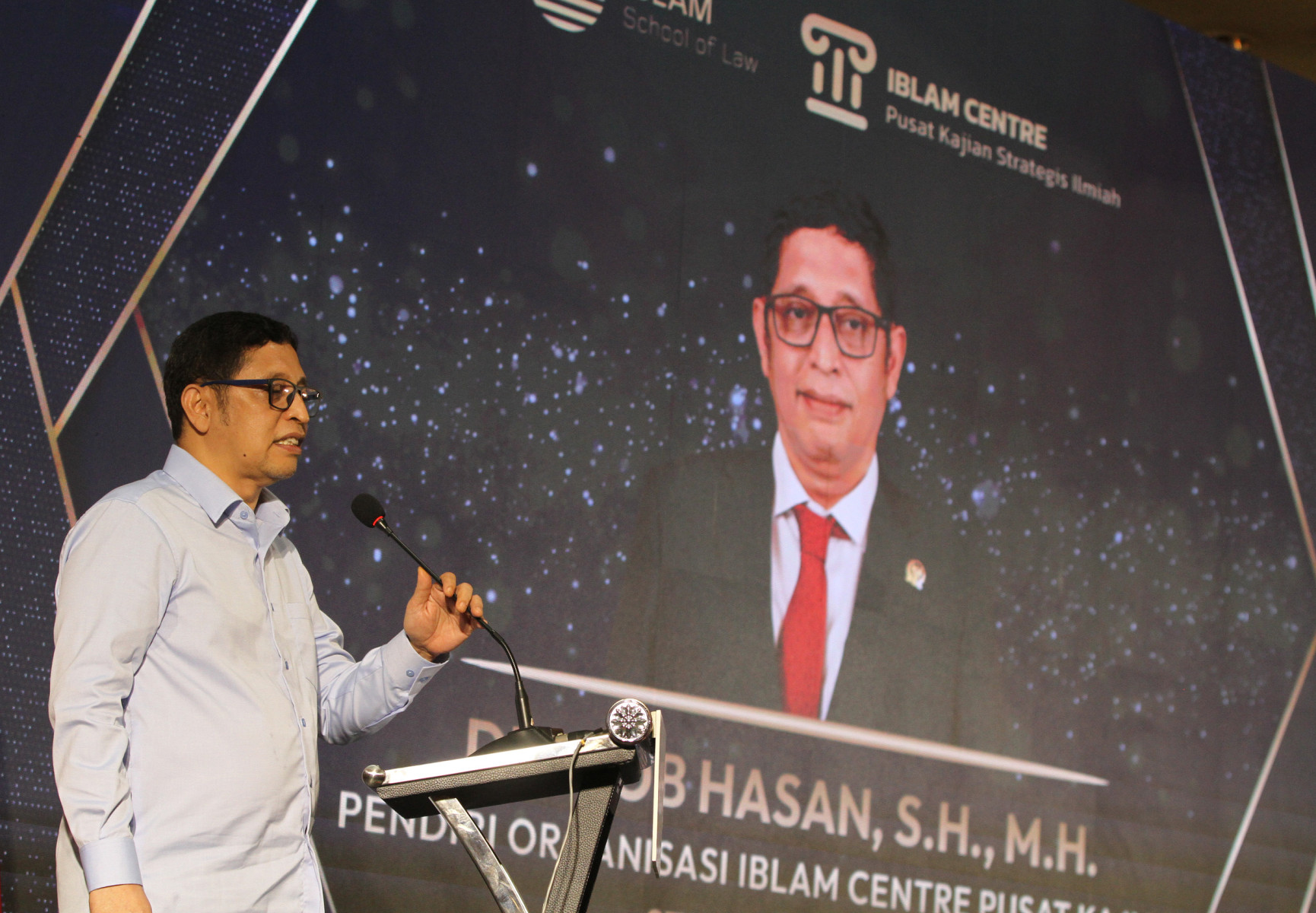 Ketua Dewan Pengarah IBLAM Centre Pusat Kajian Strategis dan Kajian Ilmiah, Dr. Bob Hasan, S.H.,M.H (kedua kiri), didampingi Pelindung IBLAM Centre Pusat Kajian Strategis dan Kajian Ilmiah, Dr. Rahmat Putranto, S.H.,M.H (kiri), Penasehat IBLAM Centre Pusat Kajian Strategis dan Kajian Ilmiah, Prof. Dr. Angkasa, S.H.,M.Hum (kedua kanan), Dewan Pengarah IBLAM Centre Pusat Kajian Strategis dan Kajian Ilmiah, Assoc.Prof.Dr.Marjan Miharja, S.H.,M.H (kanan), memukul gong saat launching IBLAM Centre – Pusat Kajian Strategis Ilmiah di Hotel Aryaduta, Jakarta, Jumat (17/1/2025).