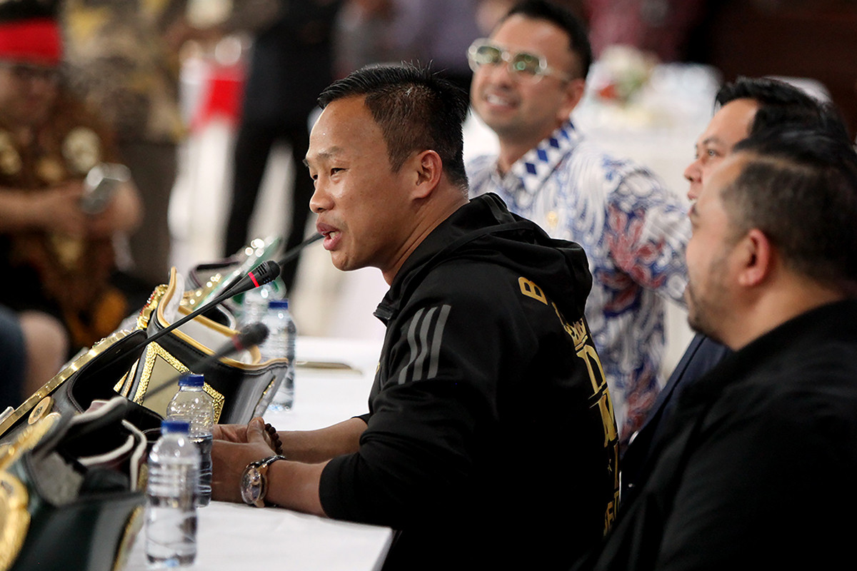 Petinju sekaligus anggota DPD RI Daud Yordan, memberikan keterangan pers jelang pertandingan tinju antara Daud Yordan melawan George Kambosos di Lobby Gedung DPD RI, Kompleks Parlemen, Senayan, Jakarta, Kamis (20/2/2025).