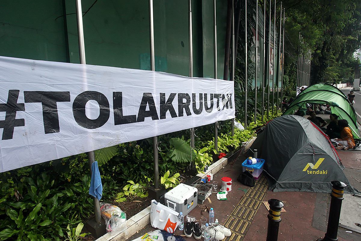 FOTO: Tolak UU TNI, Warga Bertahan Dirikan Tenda di Depan Gedung DPR