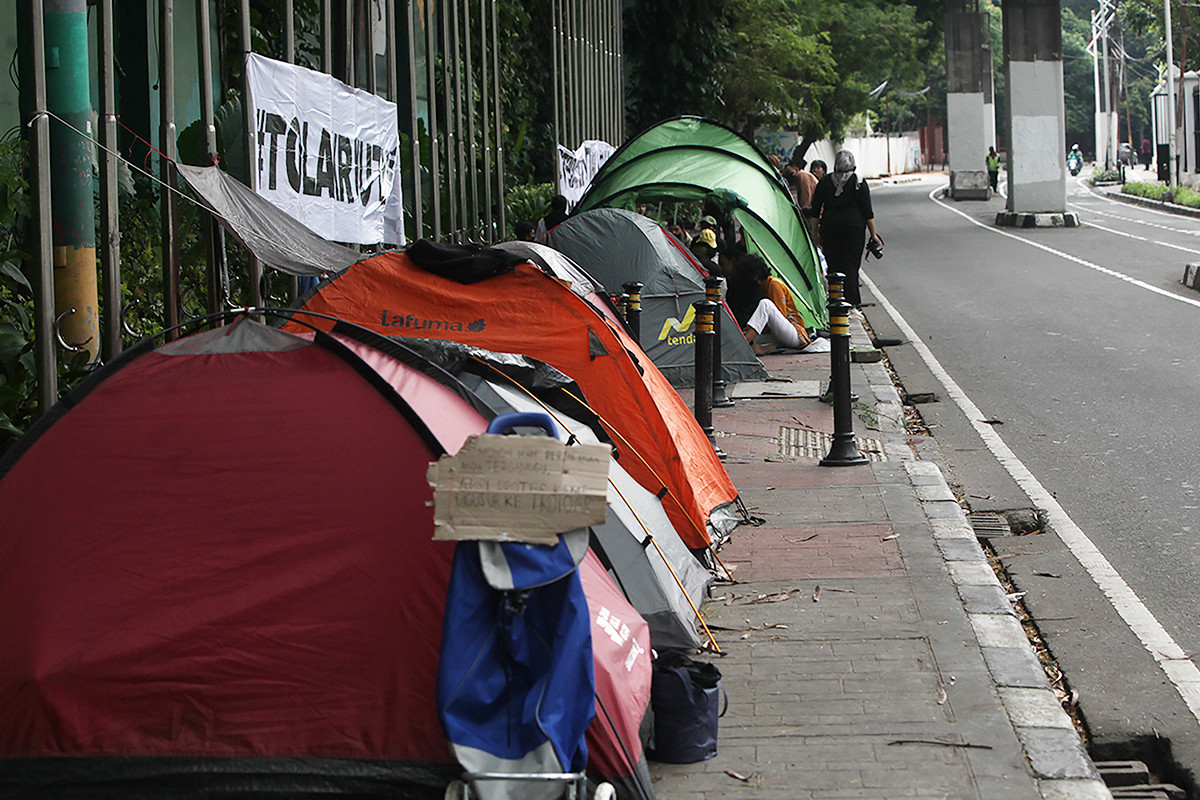 FOTO: Tolak UU TNI, Warga Bertahan Dirikan Tenda di Depan Gedung DPR