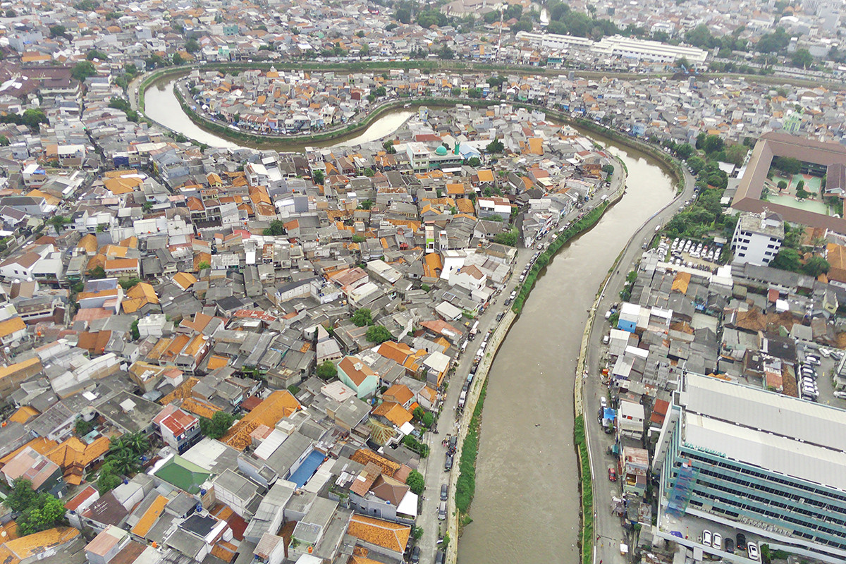 AKTUALITAS.ID – Foto udara terlihat aliran sungai Ciliwung di kawasan Bukit Duri, Jakarta, Jumat (25/4/2025). Gubernur DKI Jakarta Pramono Anung memastikan proyek normalisasi Sungai Ciliwung segera dilanjutkan. Pramono menegaskan proyek strategis tersebut dilanjutkan demi mengurangi potensi banjir Jakarta.
