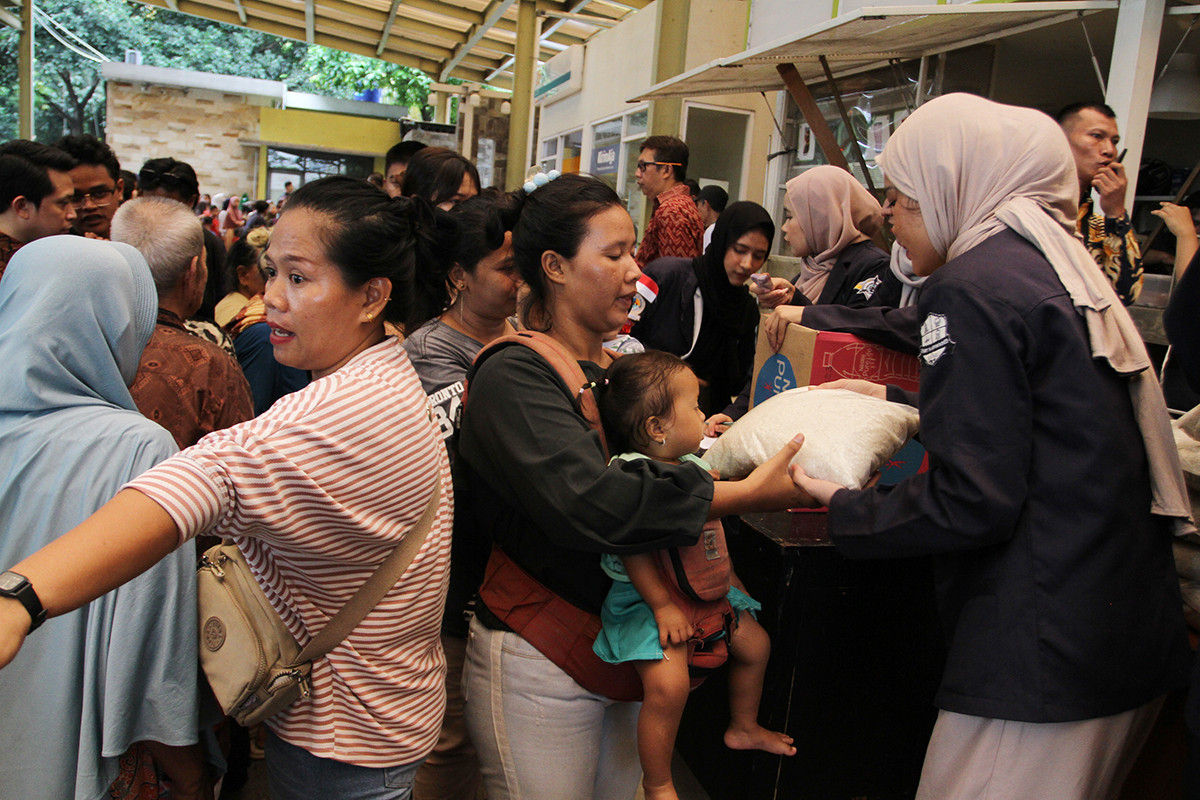 AKTUALITAS.ID – Warga antre untuk dapat beras murah yang digelar oleh sejumlah perwakilan mahasiswa dari Dewan Eksekutif Mahasiswa Institut Transportasi dan Logistik Trisakti di Jakarta, Jumat (16/5/2025). Dampak dari merosotnya perekonomian Indonesia serta tingginya gelombang PHK para pekerja dari berbagai seKtor yang melanda beberapa daerah membuat sejumlah mahasiswa dari Dewan Eksutif Mahasiswa Institut Transportasi dan Logistik Trisakti menggelar aksi sosial untuk warga sekitar. Tebus beras murah sebanyak 850 paket ini digelar dalam rangka meringankan beban masyarakat sekaligus bentuk nyata Tri Dharma Perguruan Tinggi khususnya dalam aspek pengabdian kepada masyarakat. Kegiatan sosial ini diharapkan dapat berkembang dan dilakukan oleh seluruh kampus dalam merespon situasi nasional dan perekonomian di Indonesia.