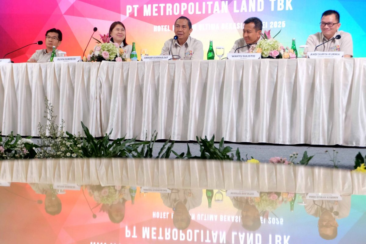 AKTUALITAS.ID – Presiden Direktur PT Metropolitan Land Tbk Anhar Sudradjat (ketiga kanan) bersama (ki-ka) Direktur Nitik Hening Muji Raharjo, Direktur Santoso, Direktur Olivia Surodjo, Direktur Wahyu Sulistio dan Direktur Andi Surya Kurnia disela konferensi pers usai Rapat Umum Pemegang Saham Tahunan (RUPST) PT Metropolitan Land Tbk di Hotel Horison Ultima Bekasi, Jawa Barat, Rabu 28 Mei 2025.