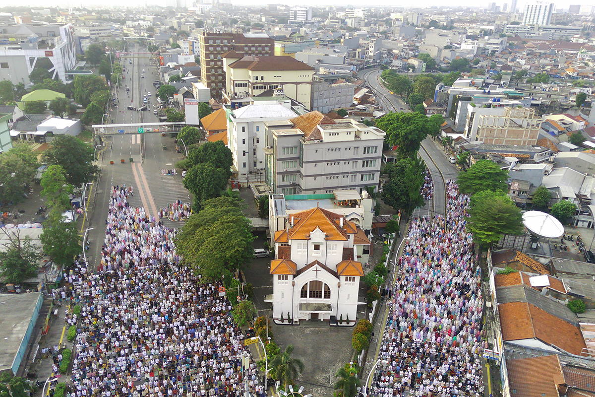 AKTUALITAS.ID – Foto udara umat Islam menunaikan shalat Idul Adha 1446 Hijriah secara berjamaah di Jalan Jatinegara Barat dan Jalan Matraman Raya, Jatinegara, Jakarta, Jumat (6/6/2025). Akses Jalan Raya Matraman dan Jalan Jatinegara Barat pun ditutup sementara selama pelaksanaan ibadah ini.