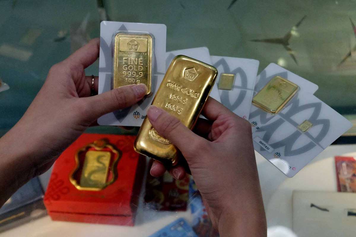 AKTUALITAS.ID – Karyawati memperlihatkan logam mulia di Butik Emas Logam Mulia Antam, Jakarta, beberapa waktu lalu.