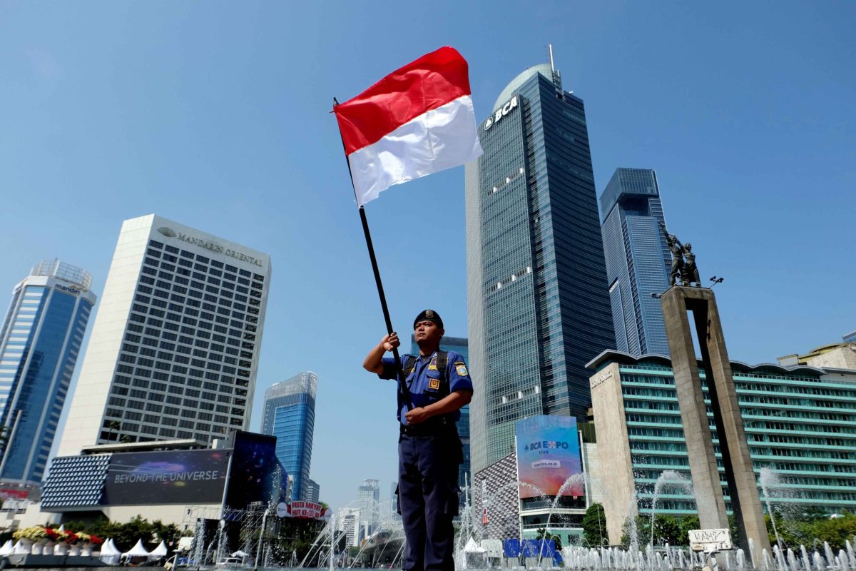 AKTUALITAS.ID – Petugas Damkar dan Polisi mengibarkan bendera merah putih di Kawasan Air Mancur Bundaran Hotel Indonesia, Jakarta, Sabtu 16 Agustus 2025.