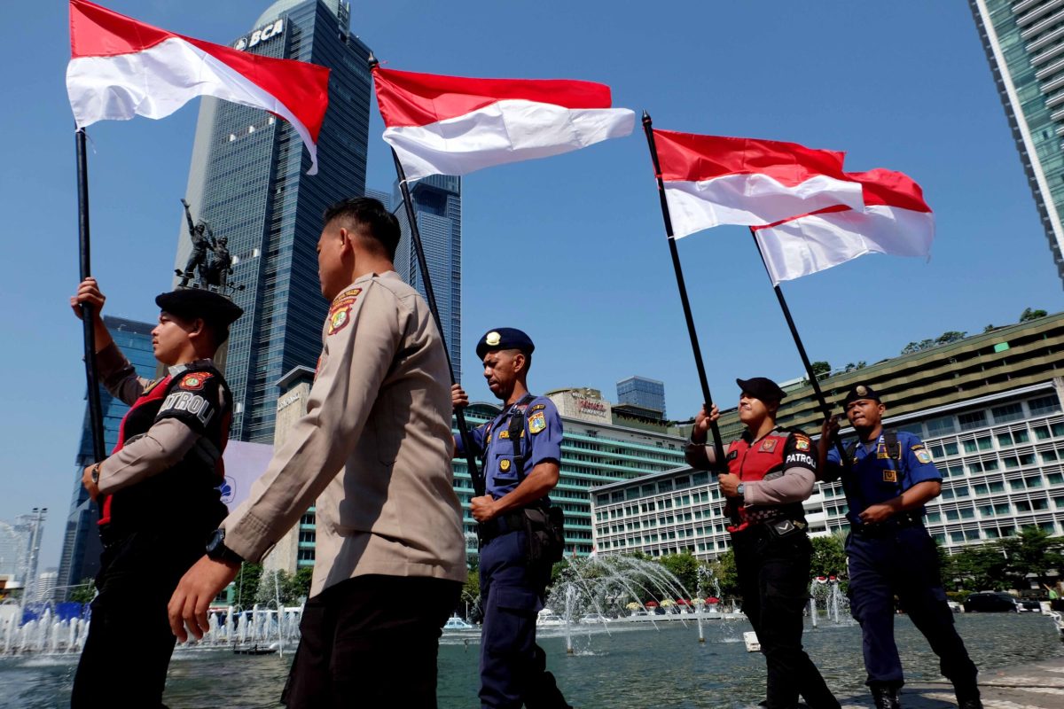 AKTUALITAS.ID – Petugas Damkar dan Polisi mengibarkan bendera merah putih di Kawasan Air Mancur Bundaran Hotel Indonesia, Jakarta, Sabtu 16 Agustus 2025.