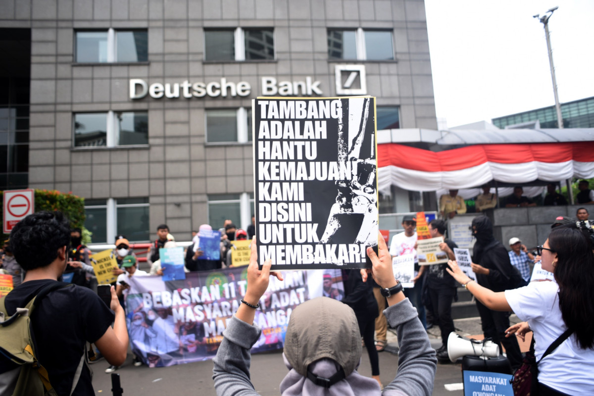 Masa melakukan aksi demo Gelombang protes terkait kriminalisasi 11 masyarakat adat Maba Sangaji, Halmahera Timur, Maluku Utara di Gedung PT Position, Jakarta.