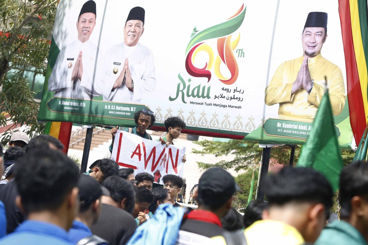 AKTUALITAS.ID – Ratusan elemen mahasiswa dari berbagai universitas di Riau melakukan aksi unjukrasa di depan Gedung DPRD Riau, Jalan Jenderal Sudirman, Tengkerang Selatan, Kota Pekanbaru, Senin (1/9/2025).