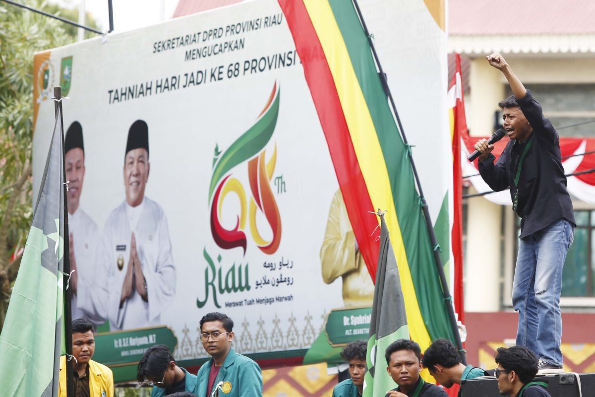 AKTUALITAS.ID – Ratusan elemen mahasiswa dari berbagai universitas di Riau melakukan aksi unjukrasa di depan Gedung DPRD Riau, Jalan Jenderal Sudirman, Tengkerang Selatan, Kota Pekanbaru, Senin (1/9/2025).