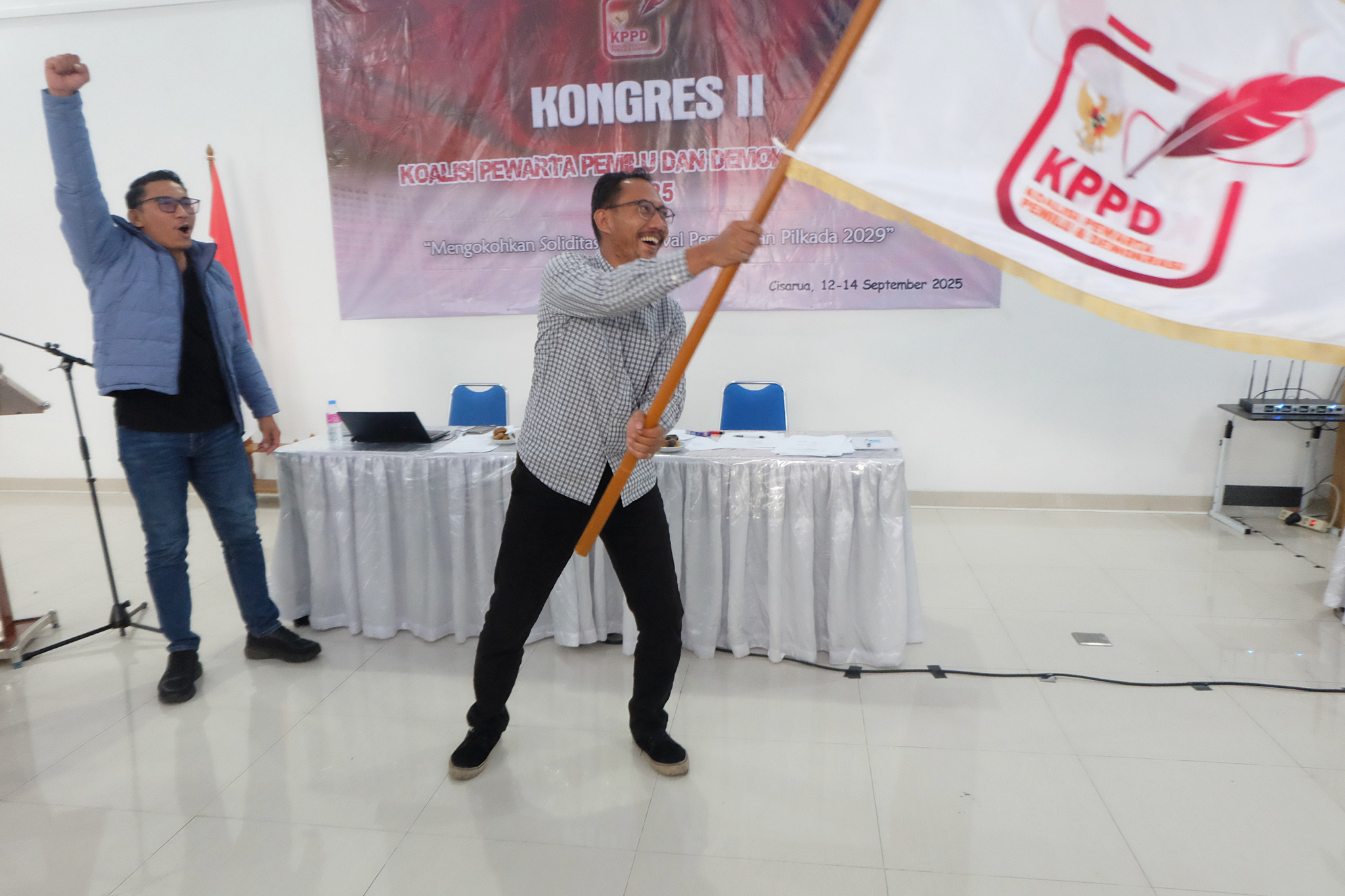 AKTUALITAS.ID – Ketua Umum Koalisi Pewarta Pemilu dan Demokrasi (KPPD) Achmad Satryo Yudhantoko mengibarkan bendera petaka setelah terpilih saat Kongres ke-2 Koalisi Pewarta Pemilu dan Demokrasi (KPPD) di Cisarua, Bogor, Jawa Barat, Sabtu (13/9/2025).