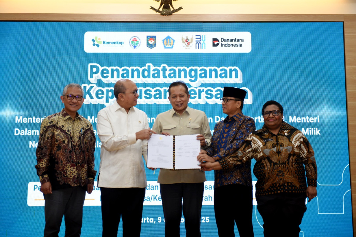 Pemerintah menyepakati dan menandatangani surat keputusan bersama (SKB) sebagai bagian dari upaya percepatan pembangunan fisik dan operasional gerai dan pergudangan Koperasi Desa/Kelurahan Merah Putih dengan menargetkan pembentukan kopdes/kopkel di lebih dari 80.000 desa dan kelurahan di seluruh Indonesia. AKTUALITAS.ID/Dede Kurniawan