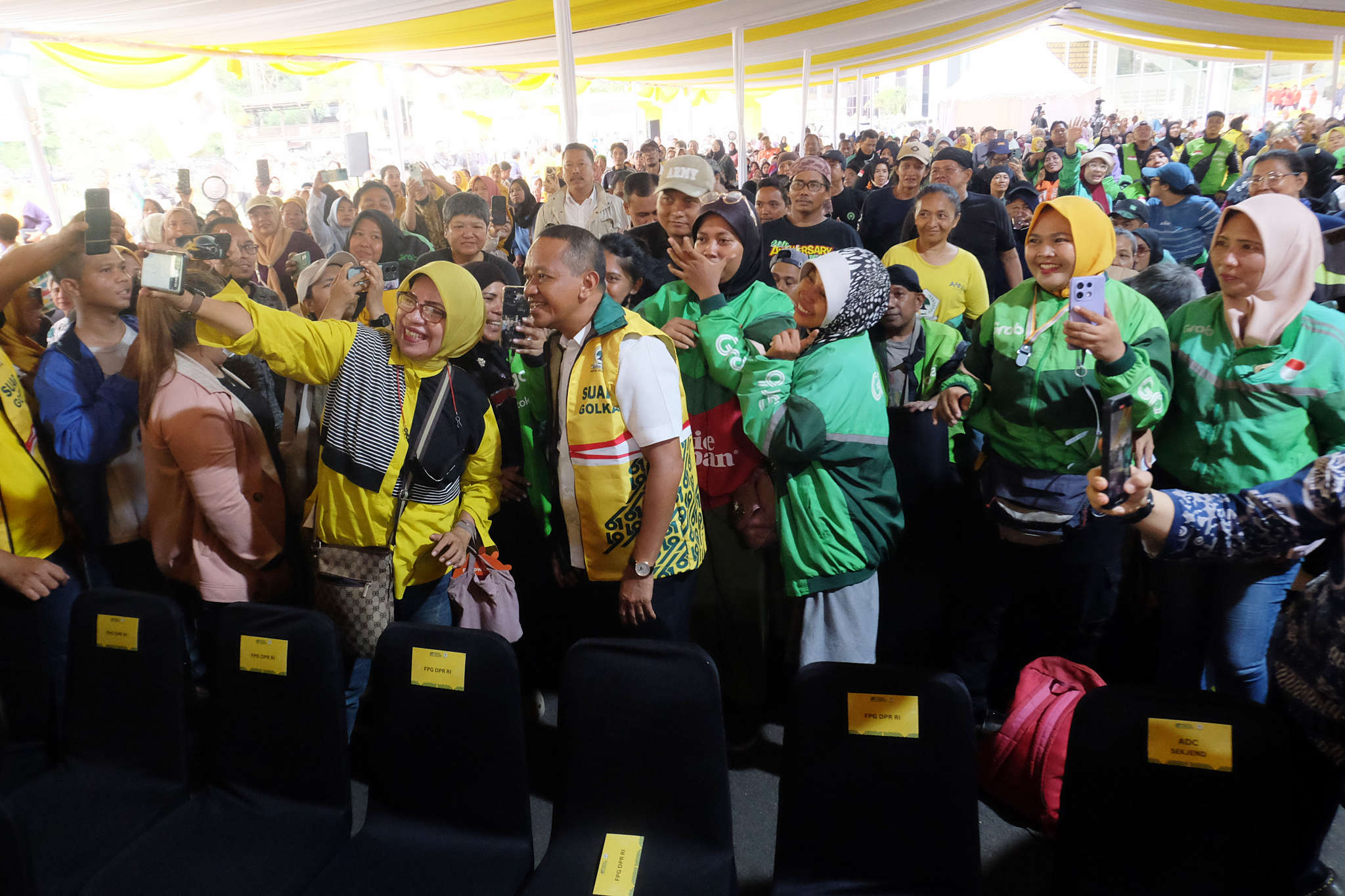 AKTUALITAS.ID – Ketua Umum Partai Golkar Bahlil Lahadalia menyapa pengemudi ojek online dan warga disela acara pembagian sembako sabagai rangkaian HUT ke-61 Partai Golkar di Kantor DPP Partai Golkar, Jakarta Barat, Rabu 22 Oktober 2025.