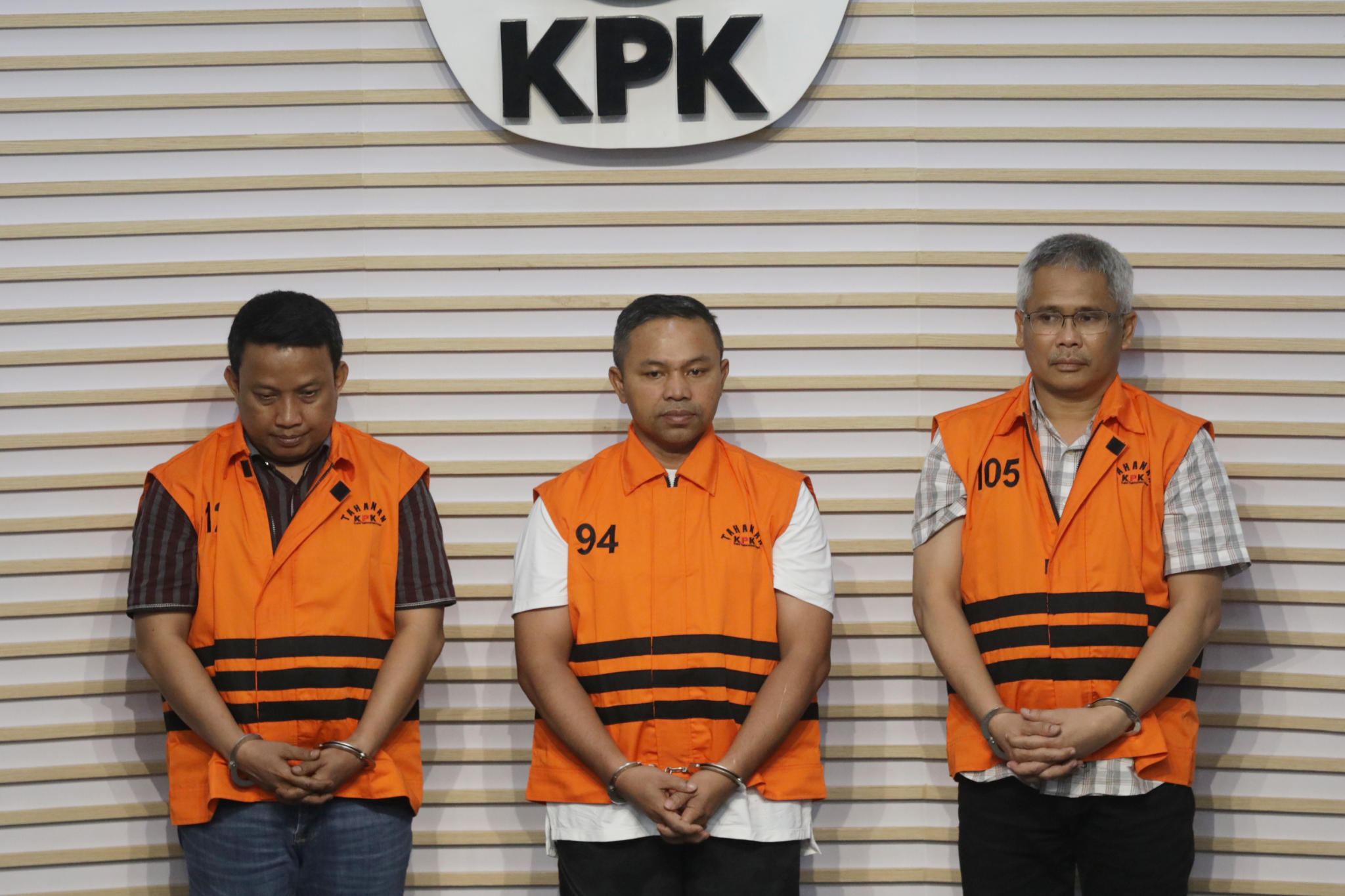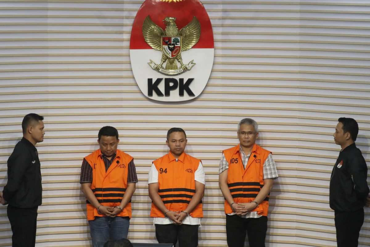 AKTUALITAS.ID – Gubernur Riau Abdul Wahid (tengah), Tenaga Ahli Gubernur Riau Dani M Nursalam (kiri), dan Kepala Dinas Pekerjaan Umum, Penataan Ruang, Perumahan, Kawasan Permukiman dan Pertanahan (PUPR PKPP) Provinsi Riau M Arief Setiawan (kanan) mengenakan rompi tahanan usai menjalani pemeriksaan di Gedung Merah Putih KPK, Jakarta, Rabu 5 November 2025.