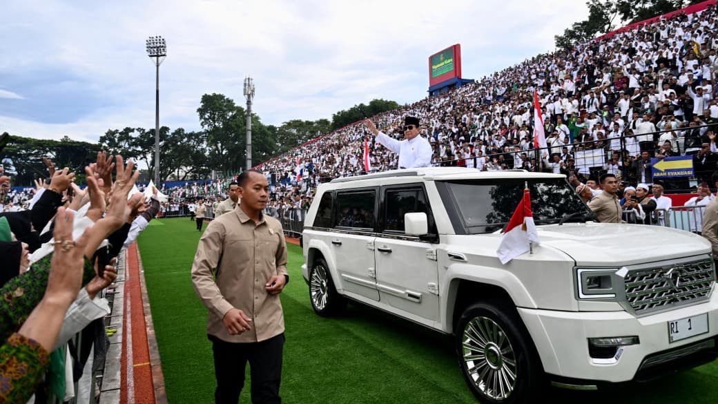 Ratusan ribu jemaah NU menyambut kehadiran Presiden Prabowo yang tiba di lokasi acara sekitar pukul 06.50 WIB. Setibanya di sana, tampak Kepala Negara menyapa para peserta yang hadir dari sejumlah daerah di Jawa Timur yang telah memenuhi stadion sejak malam harinya. AKTUALITAS.ID/ Foto: BPMI Setpres