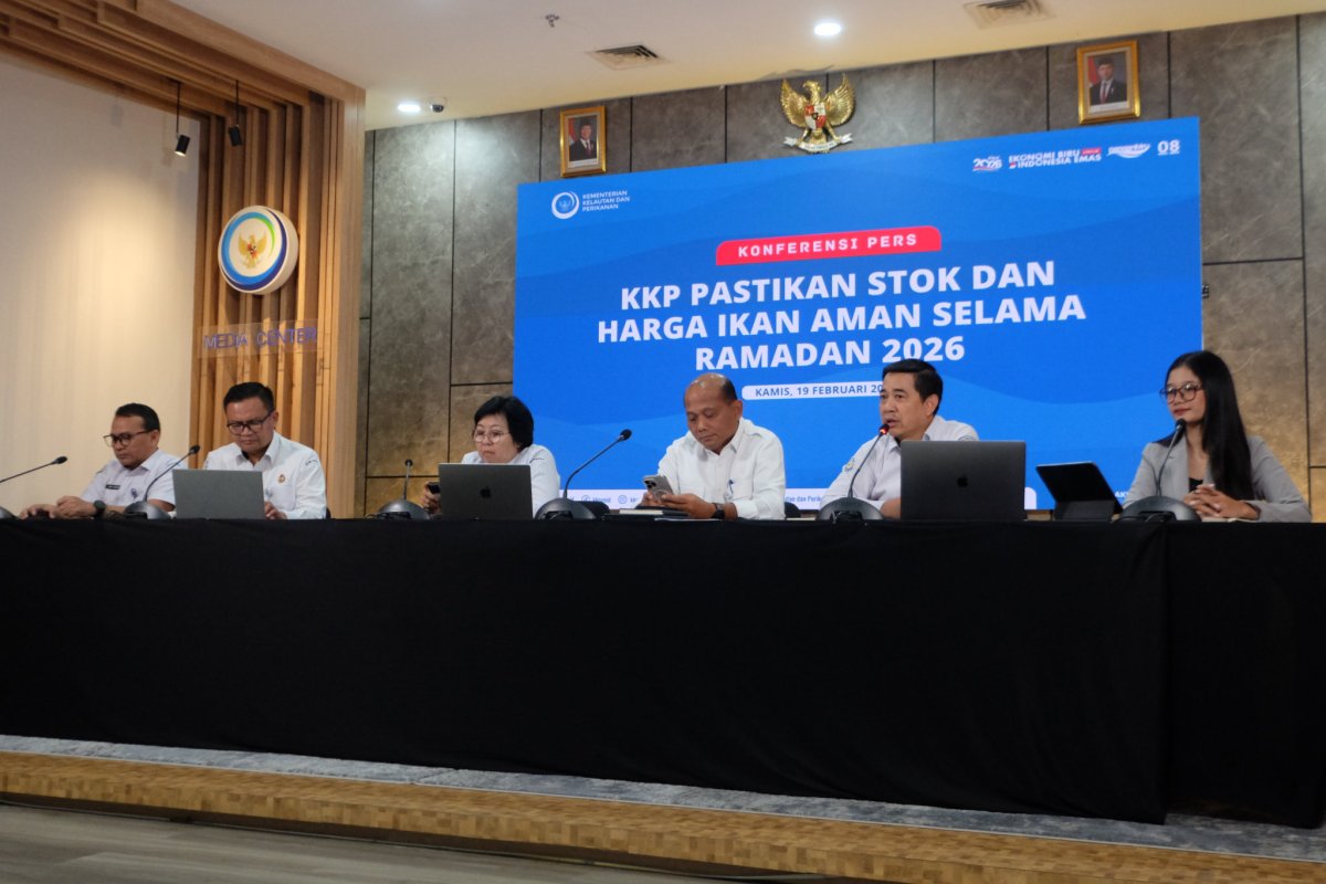 AKTUALITAS.ID – Direktur Jenderal Perikanan Budi Daya TB Haeru Rahayu (kedua kanan) bersama Direktur Kepelabuhan Perikanan DJPT Ady Candra (kiri), Plt. Sekretaris Ditjen Pengawasan Sumber Daya Kelautan dan Perikanan Saiful Umam (kedua kiri), Kepala Badan Mutu KKP Ishartini (tengah) dan Plt.Direktur Jenderal Penguatan Daya Saing Produk Kelautan dan Perikanan KKP Machmud (kanan) memberikan penjelasan saat Kementerian Kelautan dan Perikanan menggelar Konferensi Pers terkait KKP Pastikan Stok dan Harga Ikan Aman Selama Ramadan 2026 di Media Center KKP, Jakarta, Kamis 19 Februari 2026.