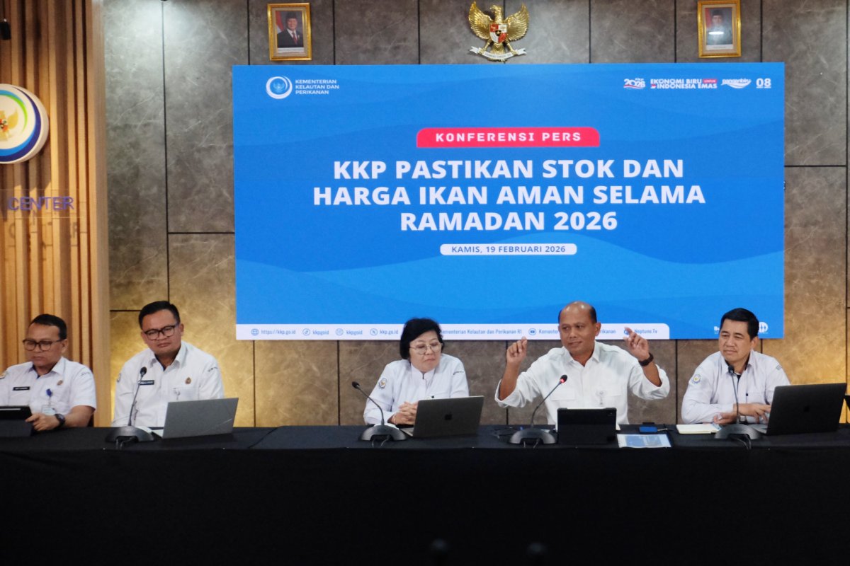 AKTUALITAS.ID – Direktur Jenderal Perikanan Budi Daya TB Haeru Rahayu (kedua kanan) bersama Direktur Kepelabuhan Perikanan DJPT Ady Candra (kiri), Plt. Sekretaris Ditjen Pengawasan Sumber Daya Kelautan dan Perikanan Saiful Umam (kedua kiri), Kepala Badan Mutu KKP Ishartini (tengah) dan Plt.Direktur Jenderal Penguatan Daya Saing Produk Kelautan dan Perikanan KKP Machmud (kanan) memberikan penjelasan saat Kementerian Kelautan dan Perikanan menggelar Konferensi Pers terkait KKP Pastikan Stok dan Harga Ikan Aman Selama Ramadan 2026 di Media Center KKP, Jakarta, Kamis 19 Februari 2026.