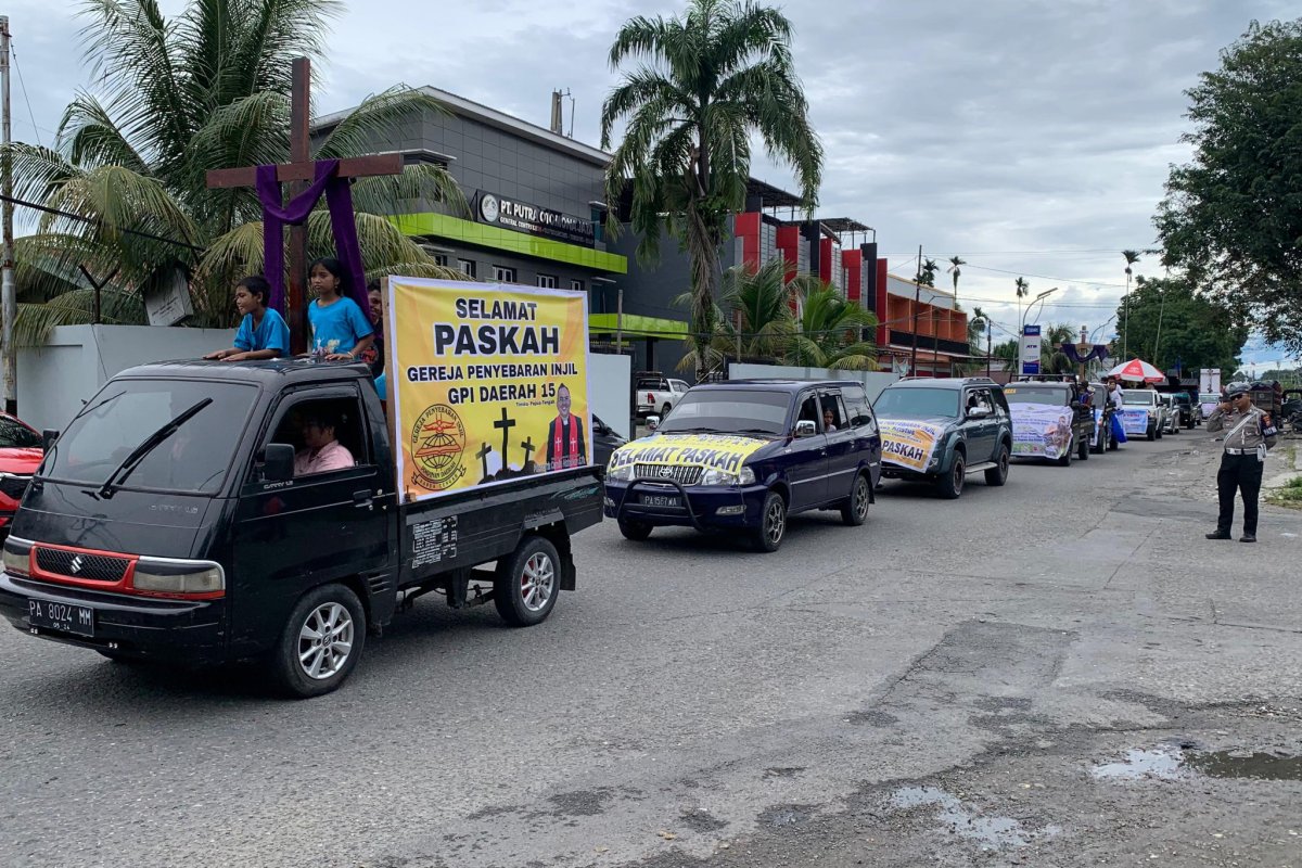 AKTUALITAS.ID – Deretan kendaraan hias melintasi Jalan Budi Utomo, Timika, menuju pusat pemerintahan dalam rangkaian Parade Paskah Lintas Agama, Selasa 7 April 2026.