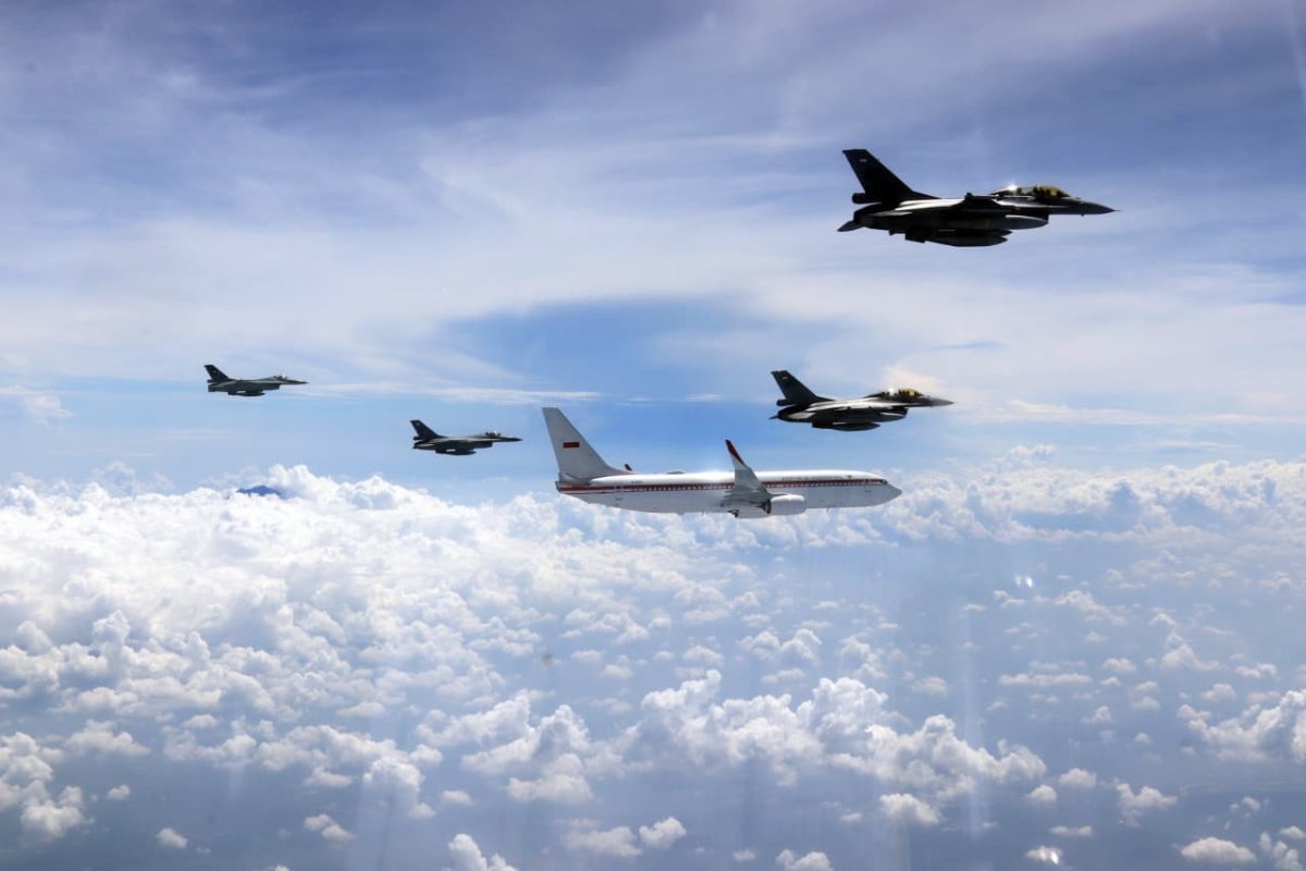 Dalam penerbangan tersebut, pesawat kepresidenan mendapat pengawalan empat pesawat tempur F-16 Fighting Falcon dan dua pesawat KAI T-50 Golden Eagle. Pengawalan udara ini merupakan pengamanan VVIP yang dilaksanakan secara profesional oleh TNI AU, sekaligus mencerminkan kesiapsiagaan dan kemampuan pertahanan udara nasional dalam melindungi pemimpin negara.