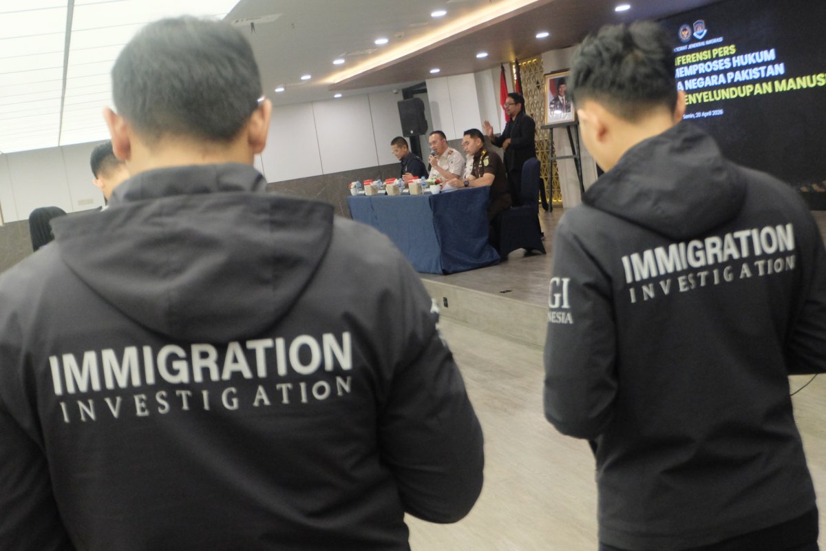 AKTUALITAS.ID – Dirjen Imigrasi Hendarsam Marantoko (kedua kiri), Direktur Pengawasan dan Penindakan Keimigrasian Yuldi Yusman (kedua kanan), Kasubdit Pra Penuntutan Kejaksaan Agung Hadiman (kanan) dan Koordinator Fungsi Komunikasi Publik Direktorat Jenderal Imigrasi Achmad Nur Saleh (kiri) menunjukkan barang bukti saat ungkap kasus dugaan Tindak Pidana Penyelundupan Manusia (TPPM) di Jakarta, Senin 20 April 2026.