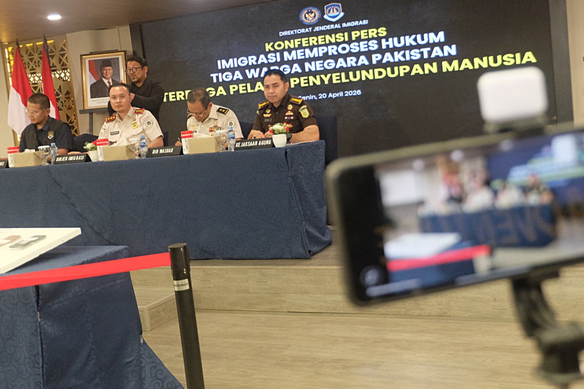 AKTUALITAS.ID – Dirjen Imigrasi Hendarsam Marantoko (kedua kiri), Direktur Pengawasan dan Penindakan Keimigrasian Yuldi Yusman (kedua kanan), Kasubdit Pra Penuntutan Kejaksaan Agung Hadiman (kanan) dan Koordinator Fungsi Komunikasi Publik Direktorat Jenderal Imigrasi Achmad Nur Saleh (kiri) menunjukkan barang bukti saat ungkap kasus dugaan Tindak Pidana Penyelundupan Manusia (TPPM) di Jakarta, Senin 20 April 2026.