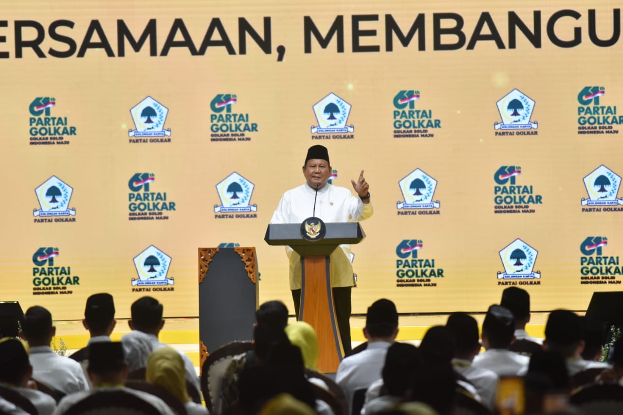 Pernyataan tersebut disampaikan Prabowo saat berpidato dalam acara puncak HUT ke-61 Partai Golkar di Istora Senayan, Jumat (5/12/2025).
