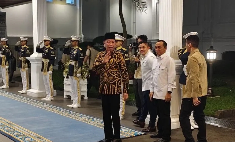 Sementara itu, Jokowi tiba di Istana Merdeka pukul 19.20 WIB. Mengenakan batik cokelat dan kopiah hitam, Jokowi disambut langsung oleh Mensesneg Prasetyo dan Seskab Teddy. Jokowi sempat melambaikan tangan kepada wartawan.