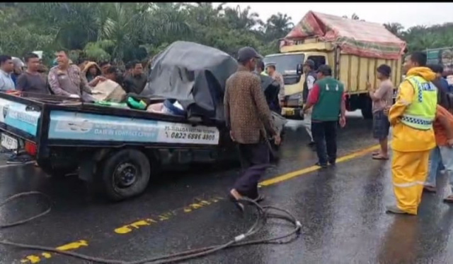 Kapolres Pelalawan AKBP John Louis Letedara SIK melalui Kasat Lantas AKP Tatit Rizkyan Hanafi STrk SIK MH membenarkan adanya tabrakan mobil pickup dengan dump truk yang menyebabkan dua orang tewas dan satu luka berat.
