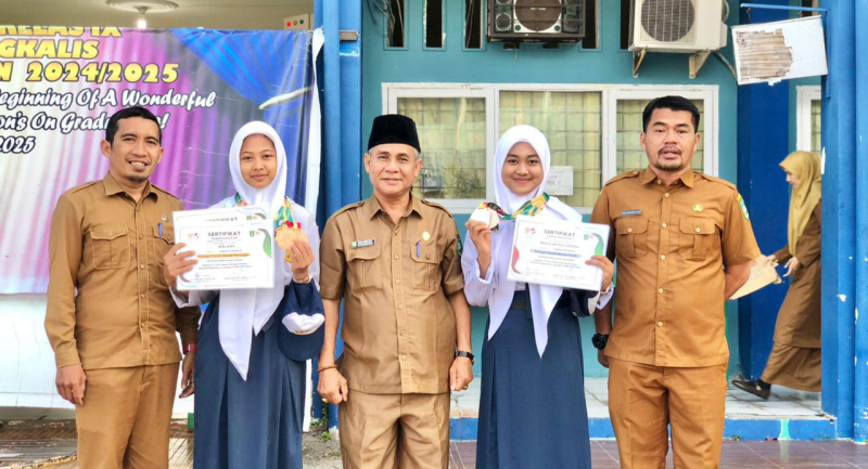 Kepala Sekolah (Kasek) SMP Negeri 1 Bengkalis, Zulfai Hinda memberikan apresiasi kepada siswi kelas 8B atas nama Rosalia Michelle Lesnussa dan Melani kelas 9 di Kejurprov Riau yang dilaksanakan 15 – 19 Desember 2025 di Lapangan Kodim 0320/Dumai Kota Dumai.